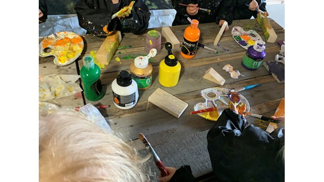 Den 31. maj besøgte otte børn og en lille håndfuld voksne fra Kristrup Vuggestue Møbelcirklen på Toldbodgade 81 for at male træklodser, som senere skulle sættes sammen til uroer og hænges op i træerne på legepladsen. Medarbejdere fra Møbelcirklen havde på forhånd savet og pudset træklodserne, så de var klar til brug.
